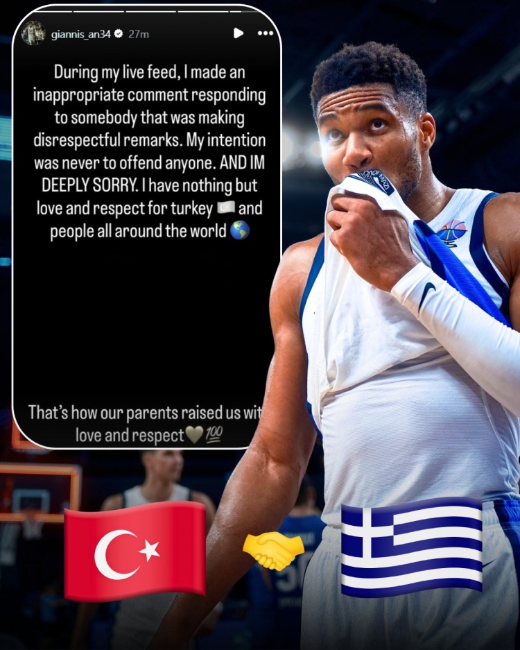 9月17日訊 字母哥更新社媒,為在自己此前在直播中對土耳其球迷的不當(dāng)言論道歉。