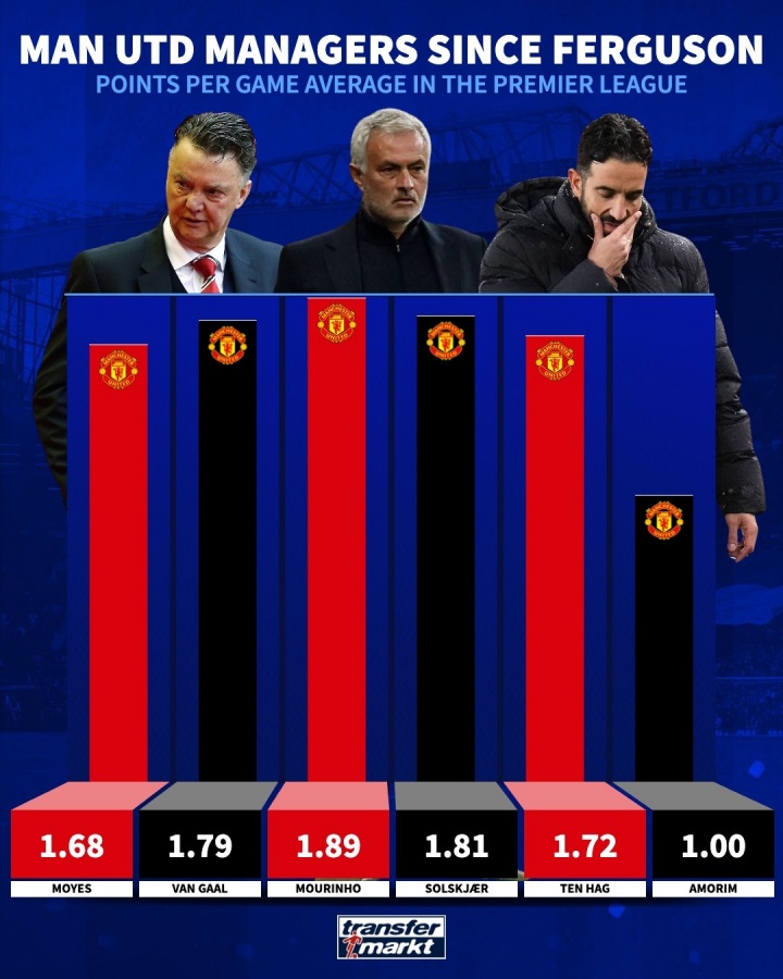 德轉統計了在弗格森爵士離任后,曼聯幾任主教練每場英超比賽平均獲得的積分情況,其中穆里尼奧場均1.89分最高,阿莫林則場均1分遠落后于幾位前任主帥。