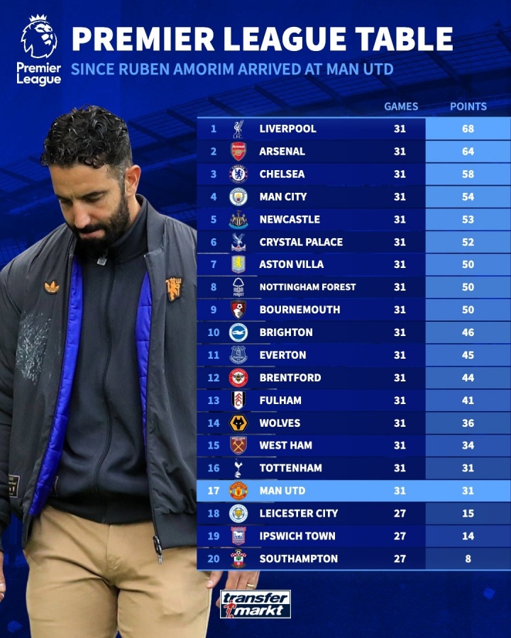 此外,阿莫林上任后帶領曼聯在31輪英超中僅獲得31分,除去涉及升降級的球隊(因場次數量不同)同期英超排名墊底,甚至不及利物浦、阿森納積分的一半。
