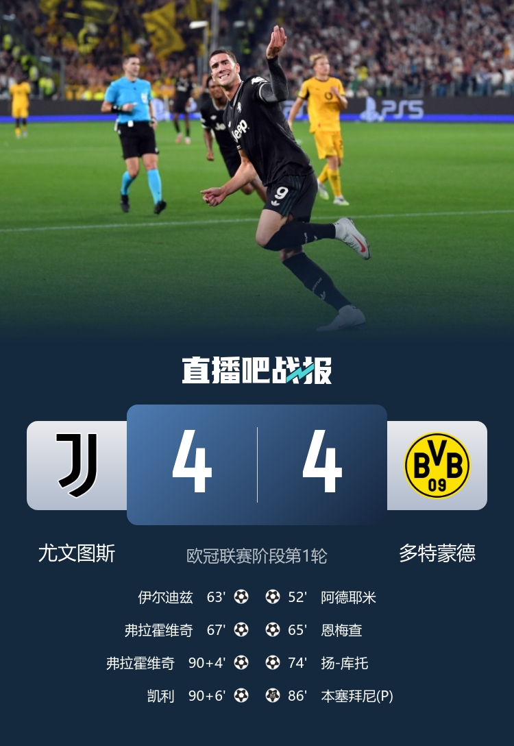 第90+4分鐘,多特后場邊路失誤,卡盧盧斷球后直接弧線傳中,弗拉霍維奇搶點破門!尤文3-4多特↓