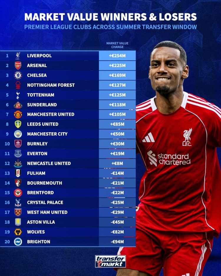 1.利物浦,+2.54億