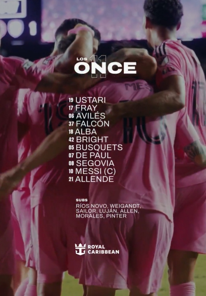 邁阿密國際首發(fā):19-烏斯塔里、17-弗雷、6-阿維萊斯、37-法爾肯、18-阿爾巴、7-德-保羅、42-布萊特、5-布斯克茨、8-特拉斯科、10-梅西、21-阿連德