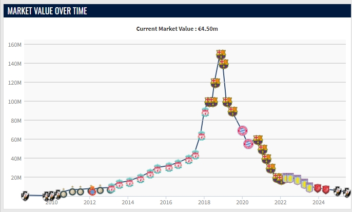 在2018年庫蒂尼奧以1.35億歐轉(zhuǎn)會費加盟巴薩,當(dāng)時庫蒂尼奧效力巴薩后的巔峰身價高達1.5億(2018年10月底)。如今6年多之后,庫蒂尼奧身價一降再降,僅有450萬歐。