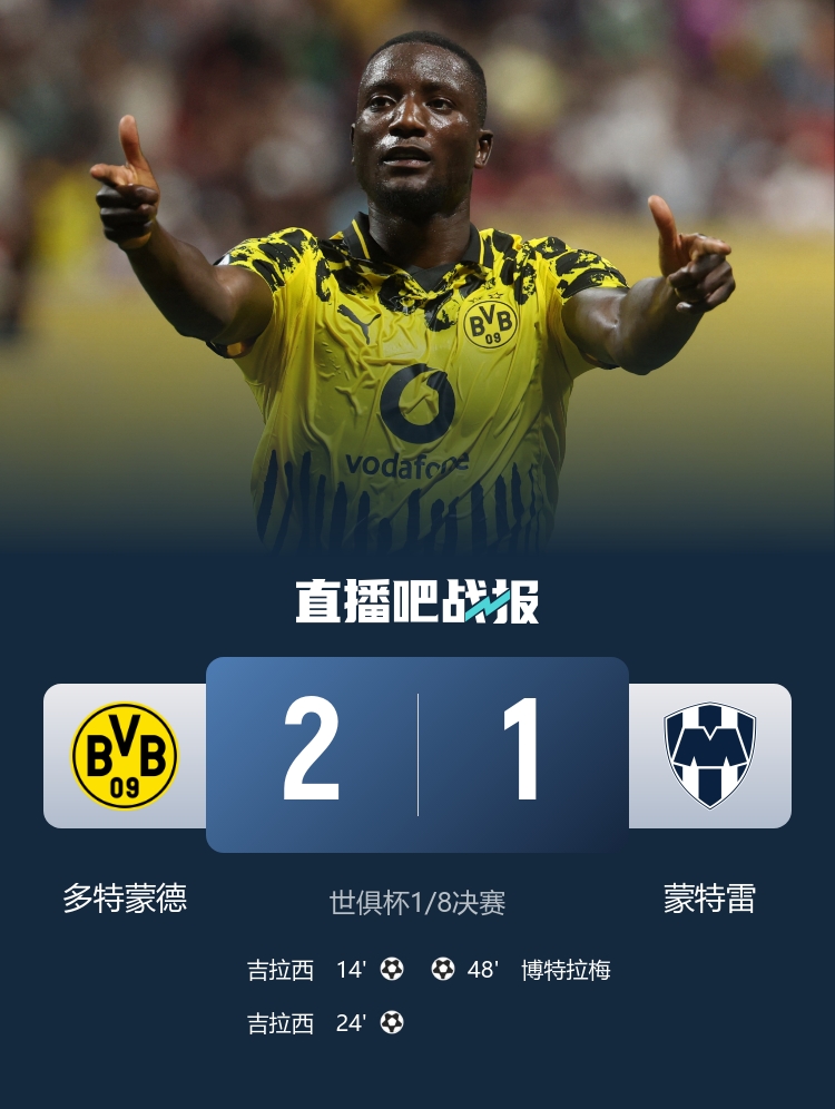 7月2日訊 北京時間9:00,世俱杯1/8決賽多特蒙德vs蒙特雷,比賽在梅賽德斯-奔馳體育場打響!上半場,阿德耶米兩送助攻,吉拉西梅開二度;科羅納擊中橫梁!小貝林厄姆染黃停賽;隨后吉拉西又錯失了戴帽機會!下半場,埃里克-阿吉雷助攻加梅-博特拉梅迅速扳回一球;隨后博特拉梅單刀破門但越位無效!最終,多特2-1擊敗蒙特雷,晉級世俱杯8強!1/4決賽將對陣皇馬!