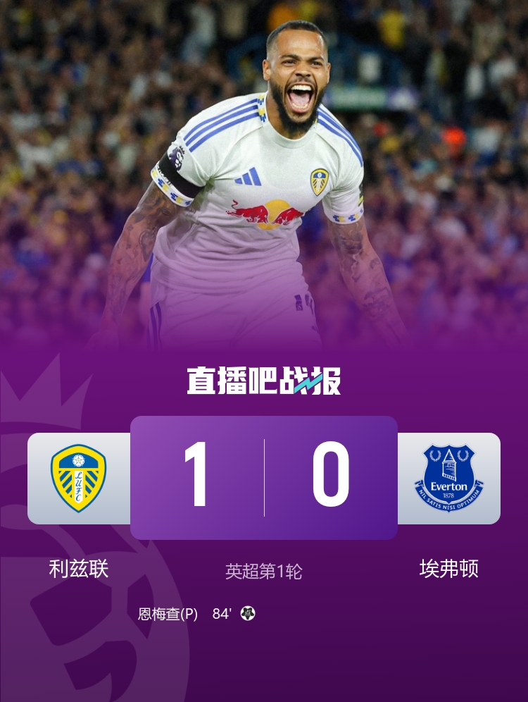 08月19日訊 英超第1輪,利茲聯(lián)在埃蘭路球場1-0戰(zhàn)勝埃弗頓,利茲聯(lián)前鋒恩梅查在84分鐘打進(jìn)制勝點(diǎn)球。