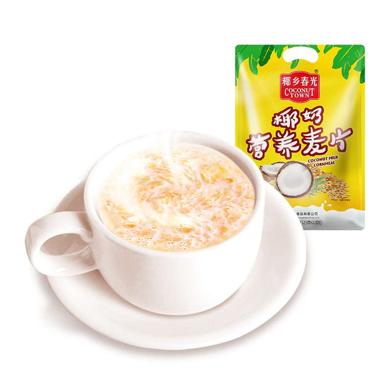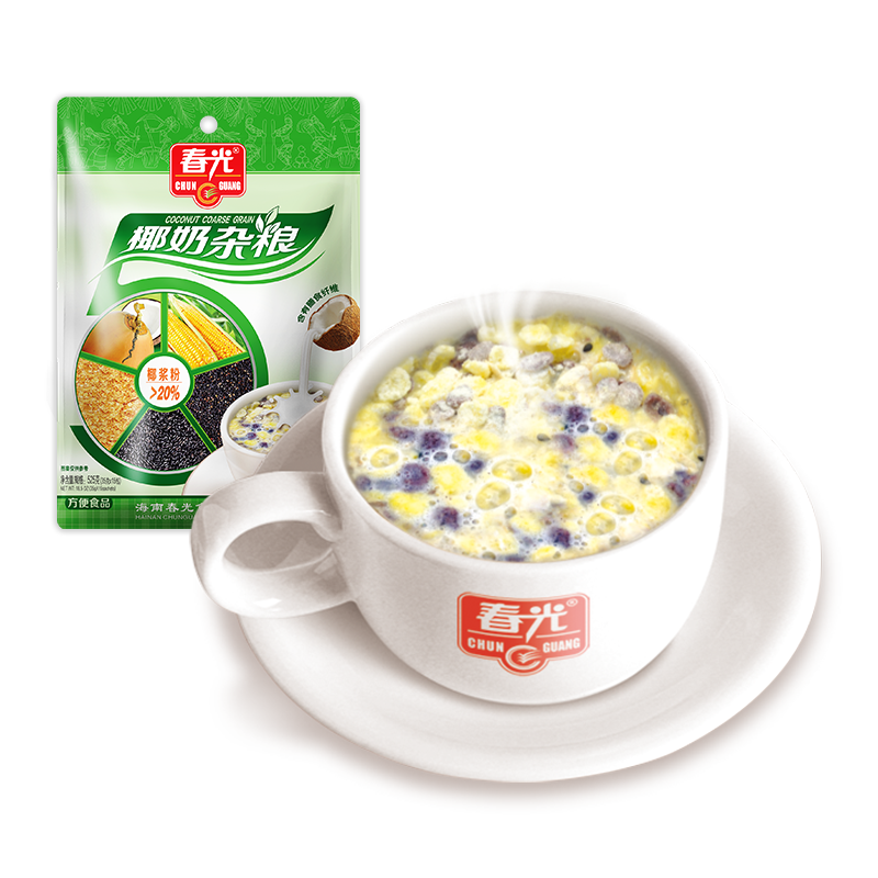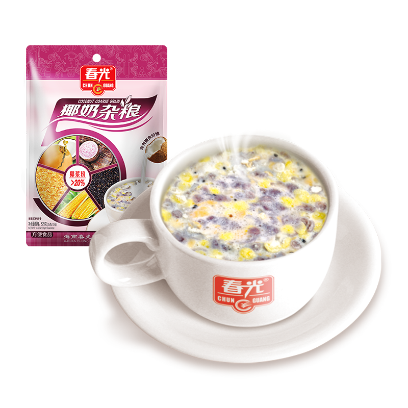 椰漿粉(20.5%)(椰子原汁、麥芽糊精、酪蛋白酸鈉、大豆磷脂、單,雙甘油脂肪酸酯、卡拉膠、辛烯基琥珀酸淀粉鈉、D-異抗壞血酸鈉)、白砂糖、植脂末、玉米、糙米、黑米、馬鈴薯淀粉、燕麥、麥片(小麥、燕麥、玉米、大豆)、乳粉、黑芝麻。