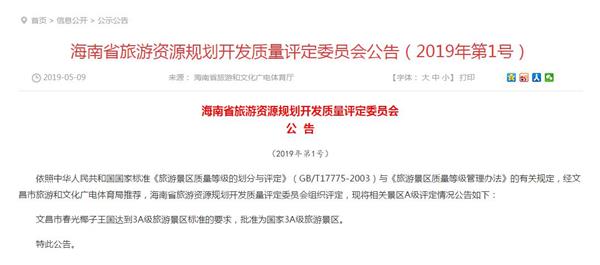 公告稱,依照中華人民共和國國家標(biāo)準《旅游景區(qū)質(zhì)量等級的劃分與評定》(GB/T17775-2003)與《旅游景區(qū)質(zhì)量等級管理辦法》的有關(guān)規(guī)定,經(jīng)文昌市旅游和文化廣電體育局推薦,海南省旅游資源規(guī)劃開發(fā)質(zhì)量評定委員會組織評定,文昌市春光椰子王國達到3A級旅游景區(qū)標(biāo)準的要求,批準為國家3A級旅游景區(qū)。
